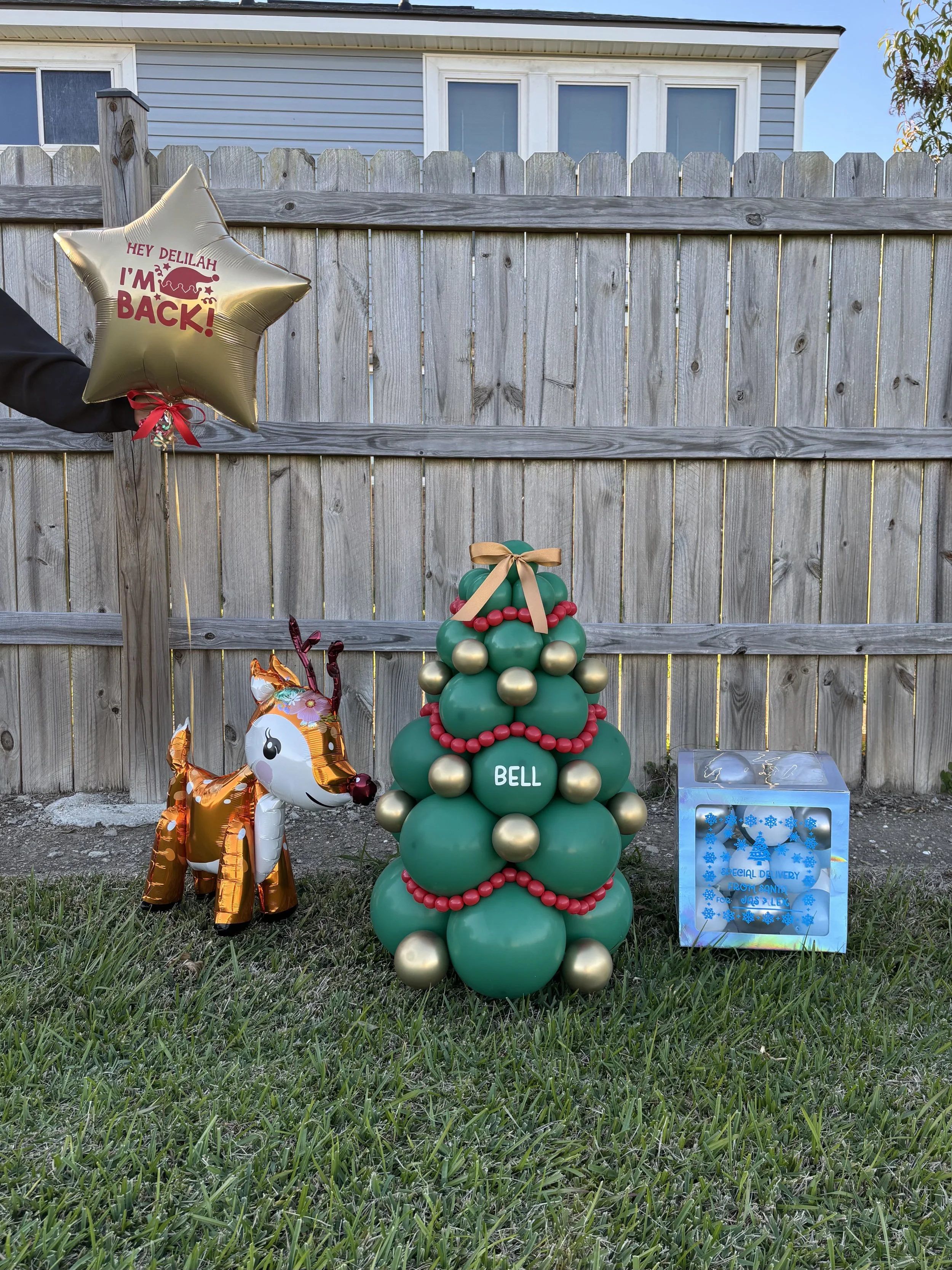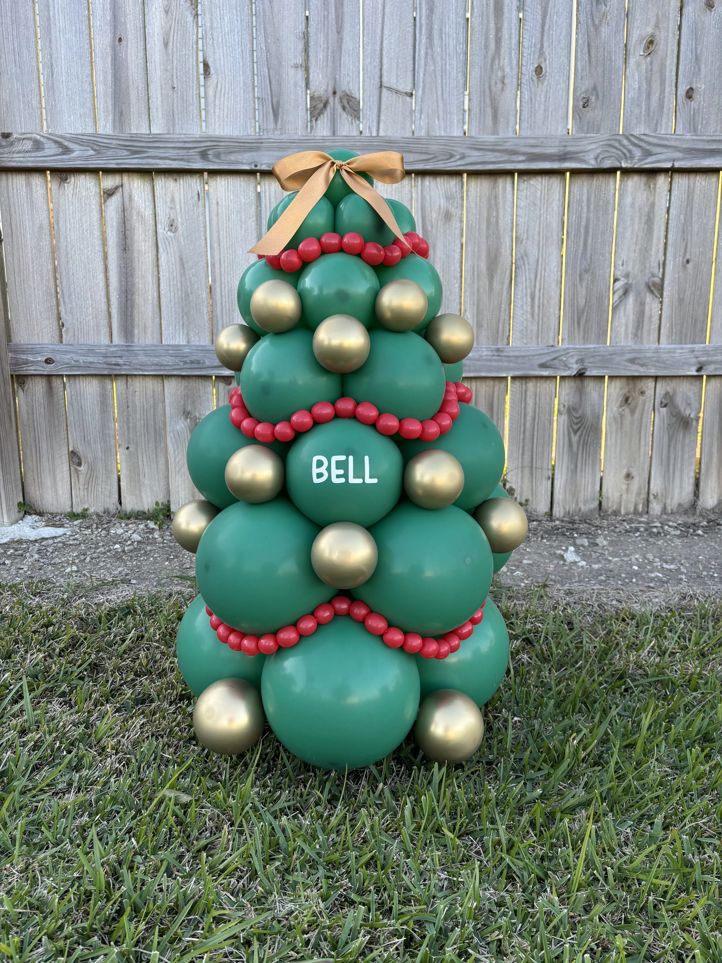 Mini Christmas Tree includes 2 1/2ft balloon tree, beading, ornament, and ribbon accessories, and custom vinyl. Additional names are $3 each. $38