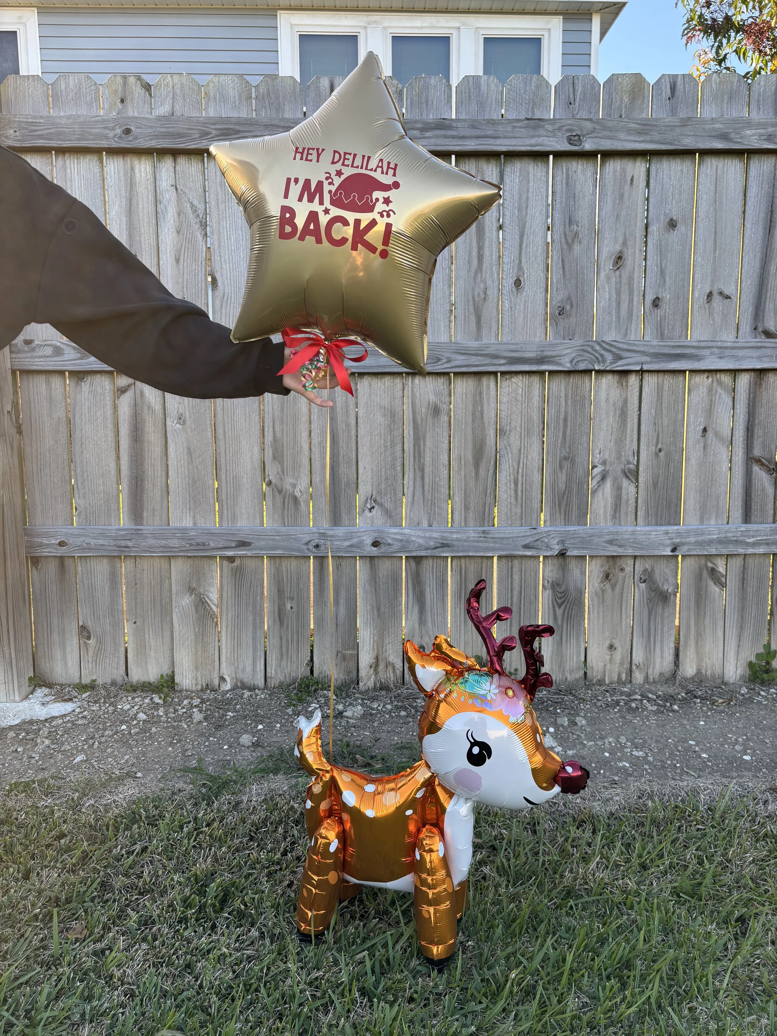 Reindeer Ride includes 2ft standing reindeer foil, helium filled star foil, custom vinyl, and ribbon accessory. $18